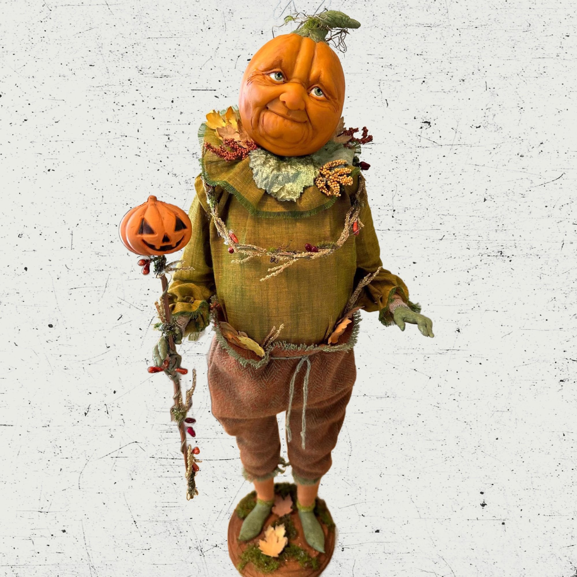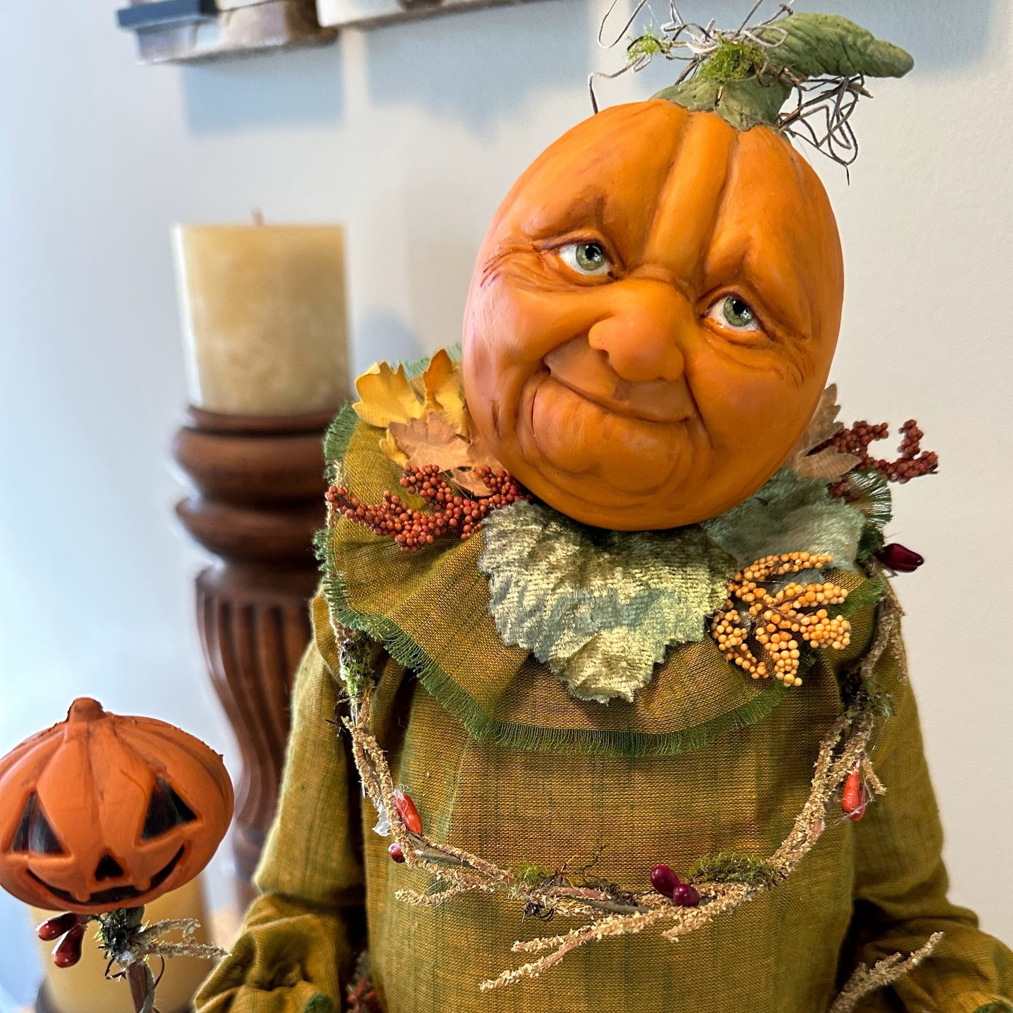 ~ Distinctive Face: Gourdon features a wonderfully expressive, hand-painted pumpkin head with a joyful, slightly mischievous smile and a realistic stem cap.