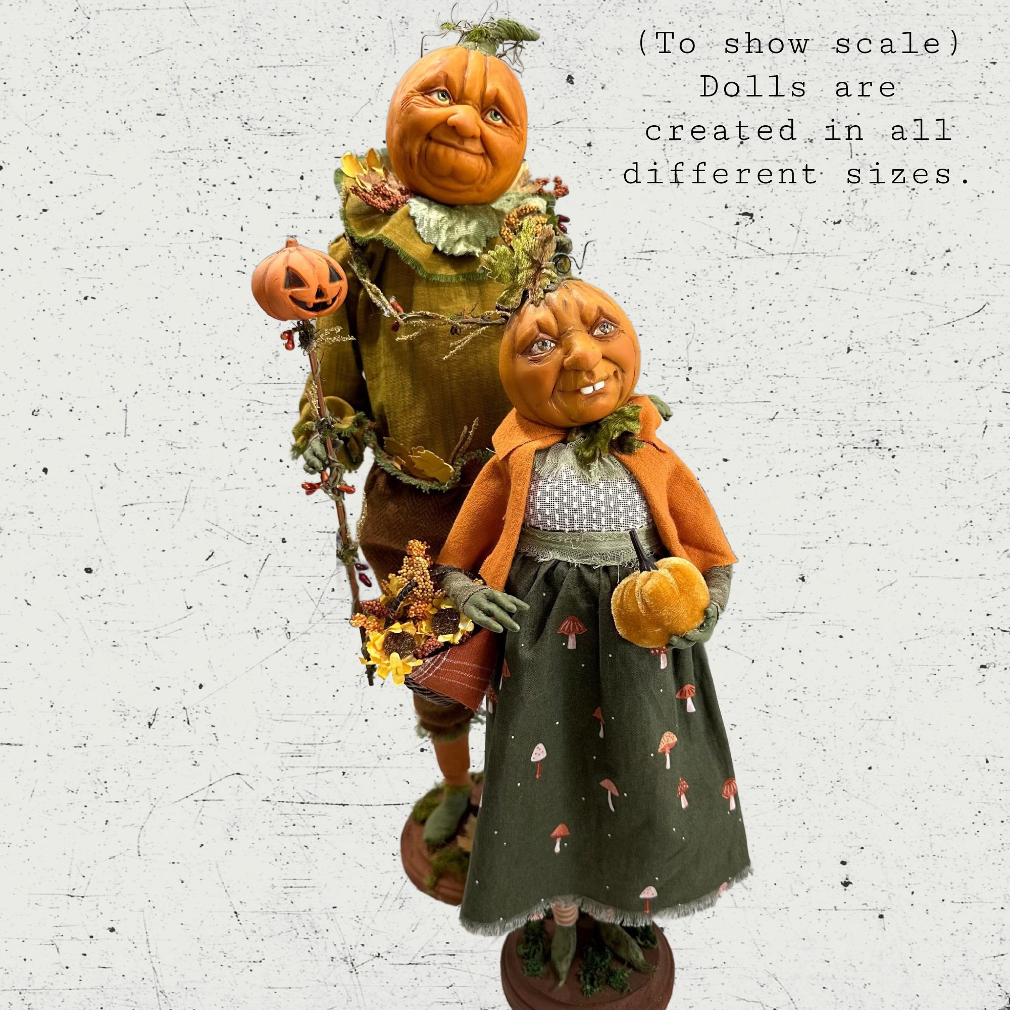 PLEASE NOTE: I am including a photo of two different dolls for scale purposes only…as I create one of a kind dolls and no two are exactly the same and some are larger than others. This listing is for the larger male pumpkin doll only.